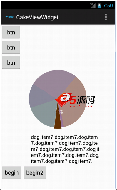 本项目是一个带动画的饼图,本项目代码注释比较详细,但是用的是property animation 动画效果最低支持3.0.测试的时候貌似在2.3.7跑不起来,用4.2测试的才截图,项目主页https://github.com/oneAcorn/cakeview编译版本4.4.2编码UTF-8依赖android-support-v7-appcompat已经一起打包了。