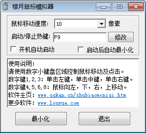 楼月鼠标模拟器是一款利用键盘来控制鼠标的移动及点击的辅助软件。如果您的鼠标坏了,或者您所处的环境不太适合使用鼠标(如冬天窝在床上),可以利用本软件来临时协助您完成鼠标的操作。