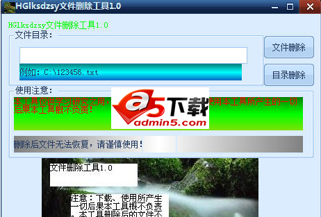 HGlksdzsy文件删除工具是一款快捷的删除工具,能够将不能打开到的文件只需输入地址即可删除。本工具仅供学习交流研究之用,请勿用商业用途。
