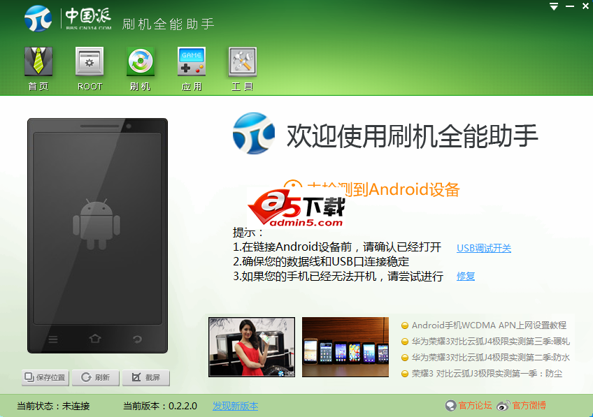 中国派全能刷机助手是一款专门辅助安卓手机管理的PC端桌面软件。支持一键ROOT,一键获取Android操作系统的超级用户权限;支持一键刷机,无论您是新手小白还是刷机达人,一键轻松搞定安卓手机;大量的ROM供你挑选,强大的ROM团队,完善的机型,保证提供更多更好的ROM资源;游戏应用下载、安装、升级、备份、卸载为一体,更有自动安装功能,帮助你管理好手机信息,清除木马软件。