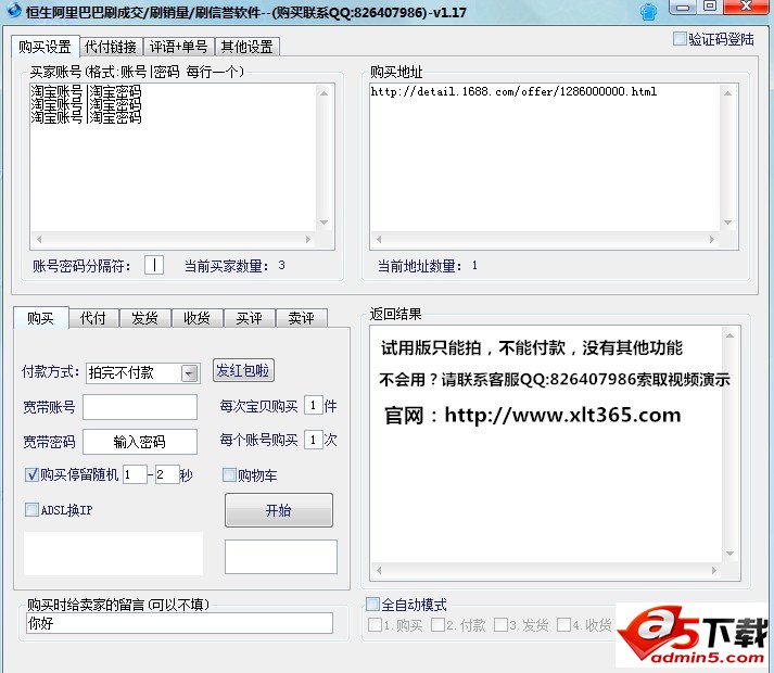 一次可以输入无限数量阿里账号和阿里巴巴商品链接自动轮换账号,自动轮换商品循环购买