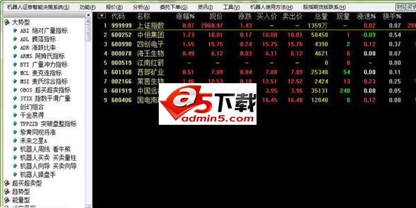 机器人操盘手免费股票行情软件是中国第一款纯粹公益性质的证券智能决策系统(让中国股民少走弯路少被骗)。也是中国第一款能智能辨别牛熊市(抄底和逃 顶),帮助牛市捂股熊市休息或者开空仓的唯一一款股票软件!还是中国第一款风险最小化收益最大化的股票软件!控制风险和抓牛市启动大顶警示是它的强项! 机器人操盘手股票软件,不光有自身的决策系统,同时也收集有众多市场上收费股票软件的系统多达几百种,供技术派研究,但不能作为买卖依据!因为很多有未来 函数或者使劲折腾人买卖,会把人折腾死的,特别是大熊市还不断提示买入,熊市进去就出不来,坑了太多股民的血汗钱。本软件无未来函数!