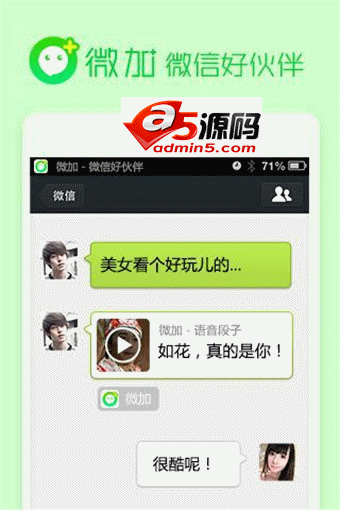 微加是一款微信个性化工具,可以说是微信的加强版,众所周知微信的表情功能很差劲,自带的就那么几个qq原版表情跟兔斯基的表情,就算5.0之后增加了表情商店也是要money的。这款微加可以帮我们添加一些好玩的表情,而且还有彩色图文聊天,个性语音,爆笑段子等功能,喜欢玩微信的机油可以试试。