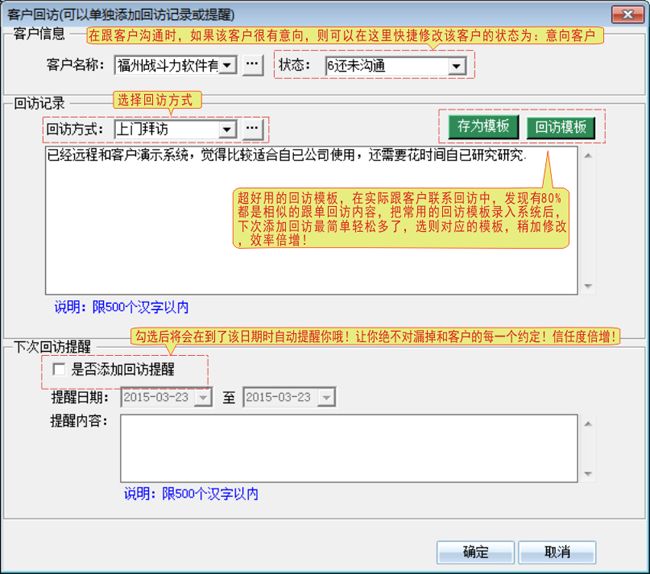 本系统有超多的人性化实用好用的功能,比如:一键百度搜索、一键聊QQ、 一键聊旺旺、一键发送短信、一键发送邮件、 一键复制、一键打开网址。填写QQ自动填写QQ邮箱、填写手机或电话自动填写归属地、自动填写客户分区 填写身份证号码自动填写生日、自动填写性别、智能去重(防碰单)、智能排序、智能统计、智能查询、智能回访、智能附件、智能分类、智能大批量导入、智能权限控制等功能。