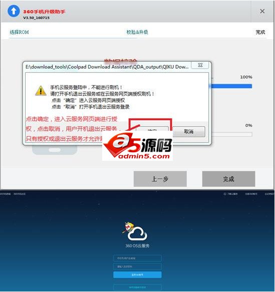 7、如果手机登陆了云服务没有退出,则不允许刷机,工具会自动弹出对话框给出提示,对话框引导用户退出云服务或者登陆网页端进行授权刷机,工具会自动检测有没有授权刷机,如果已经授权或退出云服务则允许刷机,否则不允许刷机