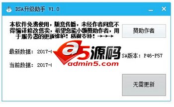 欢迎使用善领DSA升级助手V1.0,善领DSA的地图升级频率较高,每周都会有数据更新,官方升级需要从网盘下载数据库,解压覆盖原文件,操作较为繁琐,DSA升级助手为您提供更便捷的升级方案,只需将DSA升级助手下载到善领DSA根目录,直接在电脑上运行即可升级,更新的数据库为善领官方版本,支持P47-P59版本升级!如您在使用过程中遇到问题,可与我邮件联系,软件免费使用,希望有经济实力的朋友赞助一下,谢谢!