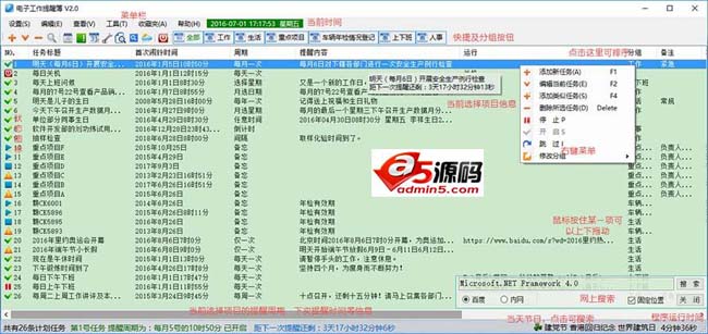 电子工作提醒簿是一款操作便捷、界面简洁但功能强大的工作生活计划任务提醒软件,内置“仅一次”、“每天一次”、“每周一次”、“选择星期”、“每月一次”、“月选日期”、“每年一次”、“月选星期”、“任意时间”、“倒计时”、“间隔”、“备忘”、“定时关机、注销、重启、锁定”、“休息及运行提醒”、“整点报时”等多种提醒模式,可以自定义多个任务与分组,可以设置某项任务“停止”、“开启”、“跳过一次”等状态,及时按需提醒。