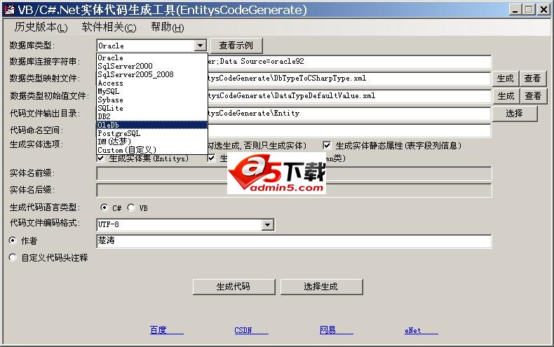 目前直接支持Oracle、SqlServer、Access、MySQL、Sybase、SQLite、DB2、PostgreSQL、DM(达梦)、OleDb和Custom(自定义)类型的数据库、PowerDesigner文件,同时也支持Informix、Firebird、MaxDB、Odbc等,可用于各种数据库。从数据库中生成表对应的VB/C#实体代码,并提取表及字段的注释等信息,亦可对生成的实体数据类型进行各种自定义的设置和方便的数据库操作等。如数据库列和VB/C#代码类型的映射、实体命名空间、代码个性化注释、是否生成对应的数据库操作等,操作简单实用。同时通过实体可实现简单数据库添加、修改、删除、查询等操作,对添加和修改提供一个统一的保存操作(即实体会根据主键或实体条件值自动判断是更新还是插入);考虑到数据库可能迁移等,所生成的操作数据库的代码,只需按生成的配置文件说明修改数据库连接,即可用于任何类型数据库的访问操作等,对应文件会自动解析,即一次生成可用于多种类型的数据库的操作;且当表字段发生重大变化时再生成一次即可。