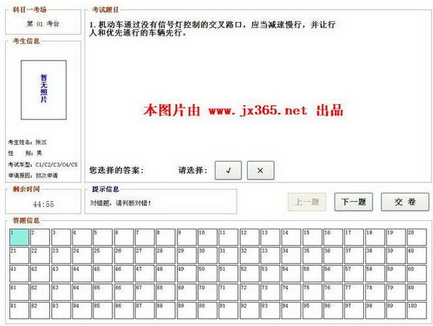 驾驶证科目一理论模拟考试系统 2012(由 驾校365 jx365.net 开发)采用的是公安部“最新题库”并且软件中的“考试题库”“考试界面”“考试流程”和正式考试都完全相同,让你能预先知道考试的情况而不慌乱。另外软件功能强大,可以让你在最短的时间内掌握考试题库,并最终通过正式考试。本软件适用各类机动车驾驶人员科目一理论模拟考试。