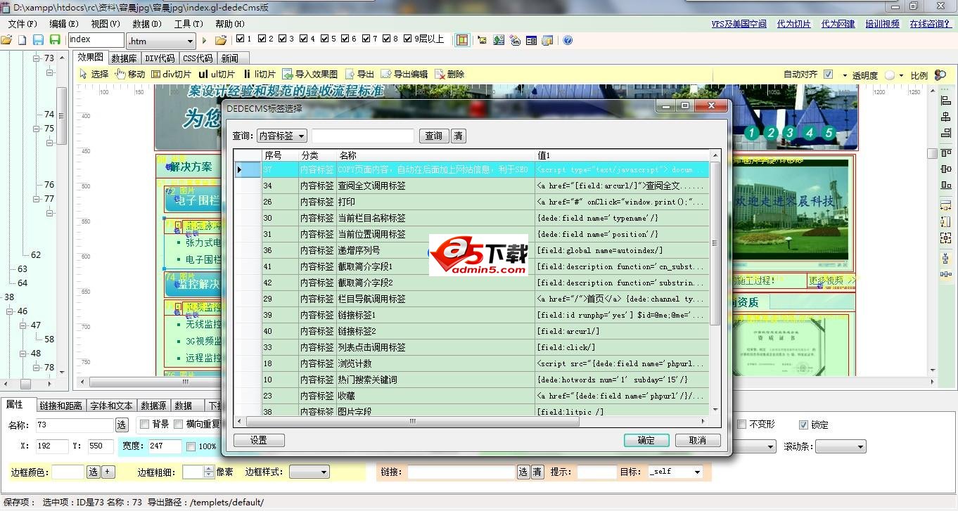 关联网页自动切片生成Div+Css软件dedeCms版是一款只需要导入效果图,拉框线就可以生成标准的兼容性的DIV+CSS,同时本身集合了DedeCMS系统的大量标签,可以直接在软件中嵌入,大大方便了开发DedeCMS网站系统,可以让您在短时间内做出标准兼容各个浏览器的dedeCms模板。《关联网页自动切片生成Div+Css软件dedeCms版》是基于DedeSMS系统网页制作、网页切片、企业网站、门户网站网页布局开发、批量做模板的最佳工具。