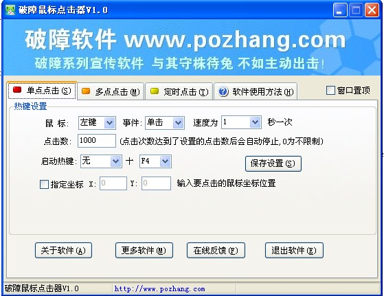 破障鼠标点击器是一个很有用的免费小软件,如果你在平时的游戏或是工作中经常需要大量点击鼠标左键或右键,如果你喜欢玩网络游戏,RPG游戏,那么一定有大量点击鼠标的经验,非常浪费时间,浪费精力,消耗鼠标1这个小软件可以解放你的手指啦!只要按下热键,让鼠标自动点击器帮你点击吧!鼠标点击速度可以调节,鼠标左键右键也可以选择。新版本可以自定义热键。如有什么问题请上破障软件官网,那里有软件的使用方法..