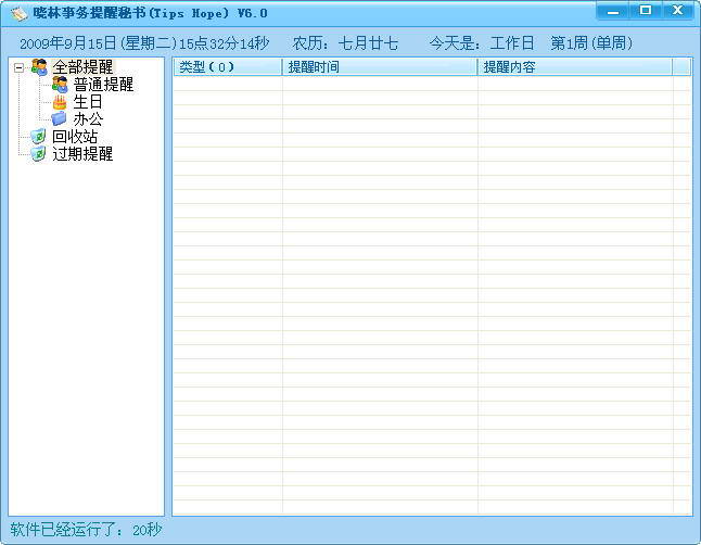 晓林事务提醒秘书是一款有快速生日提醒功能,无论农历还是阳历生日提醒,都快速添加。农历提醒模式,可以提醒农历节日以及生日,解决大多数同类软件只能提醒公历日期的弊病,可以方便显示今天、明天、后天和本月内的提醒。