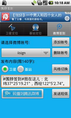 《围脖签到》是一款基于腾讯微博开放平台的作品。本软件为用户提供了卫星定位和基站定位两种定位方式,用于获取当前的地理位置信息。通过该软件,用户可以轻松的将地址位置信息发布至自己的腾讯微博上,实现特殊的微博签到,随时随地随便签。简单软件,简单生活。