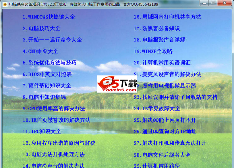 电脑菜鸟必备知识宝典收选三十篇最常用的电脑基础知识,包含电脑快捷键大全、运行命令大全、WINDOWS使用技巧大全、系统优化方法、硬件基础知识、bios详解、IPS$知识大全、防黑客必备知识等等。另外软件还有7个隐藏的金蛋,包括诗词、对联以及娱乐模块。