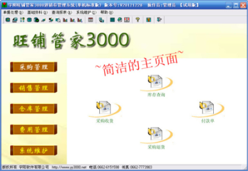 宇阳“旺铺管家3000”进销存软件,拥有不同版本,例如:单机普及版、单机标准版、SQL单机/网络标准版、POS通用版本等。软件功能全面,界面简洁,操作简单易懂!欢迎免费下载使用!