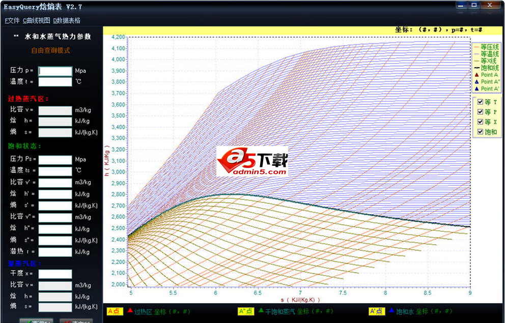 easyquery焓熵图表查询提供水和水蒸气性质图表查询,焓熵表软件查询,焓熵图软件绘制,焓熵图查询!查询使用 中间插值法,非常准确!此软件完全免费!