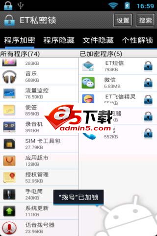 ET私密锁一款针对Android手机上开发程序加密软件,可以对手机上安装的所有软件进行加密,不管是您的名片夹,通讯记录,短信,照片,音乐,多媒体资料,包括第三方软件,游戏,充分做到物归我管,完全加密保护。
