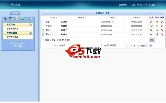 起航报名查询系统主要功能:查看报名信息,修改报名信息,处理报名信息,删除报名信息等