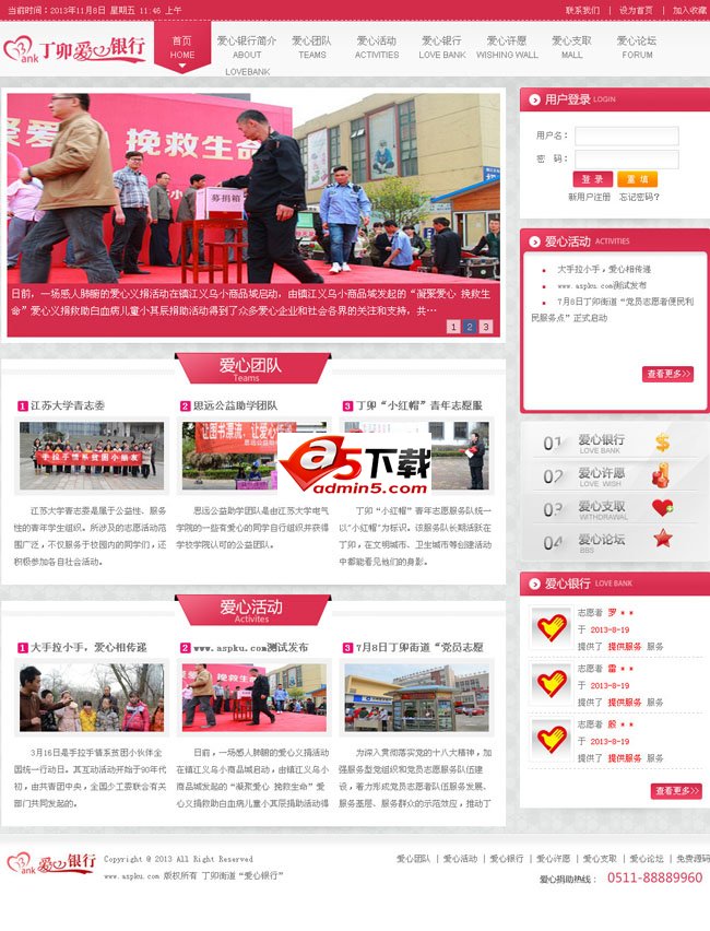 源码类别: 某漂亮的爱心银行公益活动网站程序 使用范围:公益组织源码,公益网站源码,爱心网站源码,公益组织网站程序 安装说明:见压缩包! 其它介绍:某漂亮的爱心银行公益活动网站程序,模板十分漂亮,含会员中心。模板界面很漂亮,美工不错,功能简单,适合二次开发,如果好好改改,可以作为不错的公益活动网站程序使用。