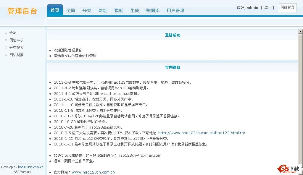 2010-1-11 最新修复网站放在子目录上栏目页样式问题,有此问题的用户请下载最新版覆盖修复。2010-1-15 同步hao123分类顺序,最新更新hao123职业与爱好分类。