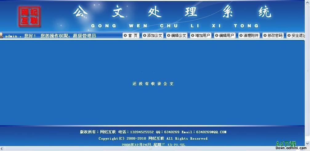 《公文处理系统》- 采用ASP+ACCESS开发的一套具有方便、快速、安全、高效的公文处理系统。本系统功能完备、使用方便快捷,已在全国各地的政府、司法、教育等部门成功应用,并得到了多方一致好评。本系统从公文的添加、查阅、修改、删除、导出等操作都采用最灵活的处理方式,确保用户快速掌握本系统。