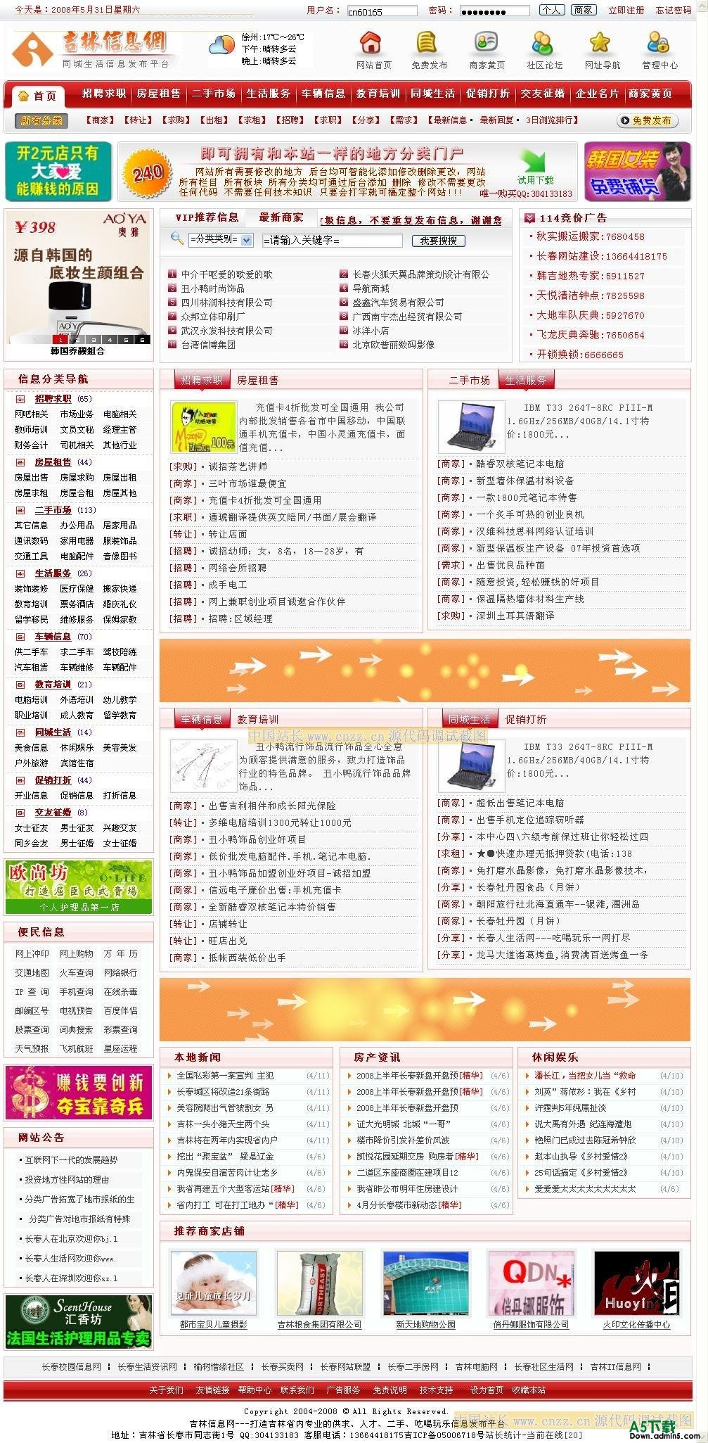 一套现成的分类信息网站发布系统,拥有完善的数据分类和简洁的网页设计,适合于做城市门户网站、报社分类广告网站、行业分类信息网站,加入了社区化网站经营理念和成功的信息置顶赢利模式,更强的网站交互式功能,网站内容由信息发布者和网站浏览者共建、赢利点也由发布的信息产生,是一套带有成功赢利模式的优秀的Web2.0网站全站系统