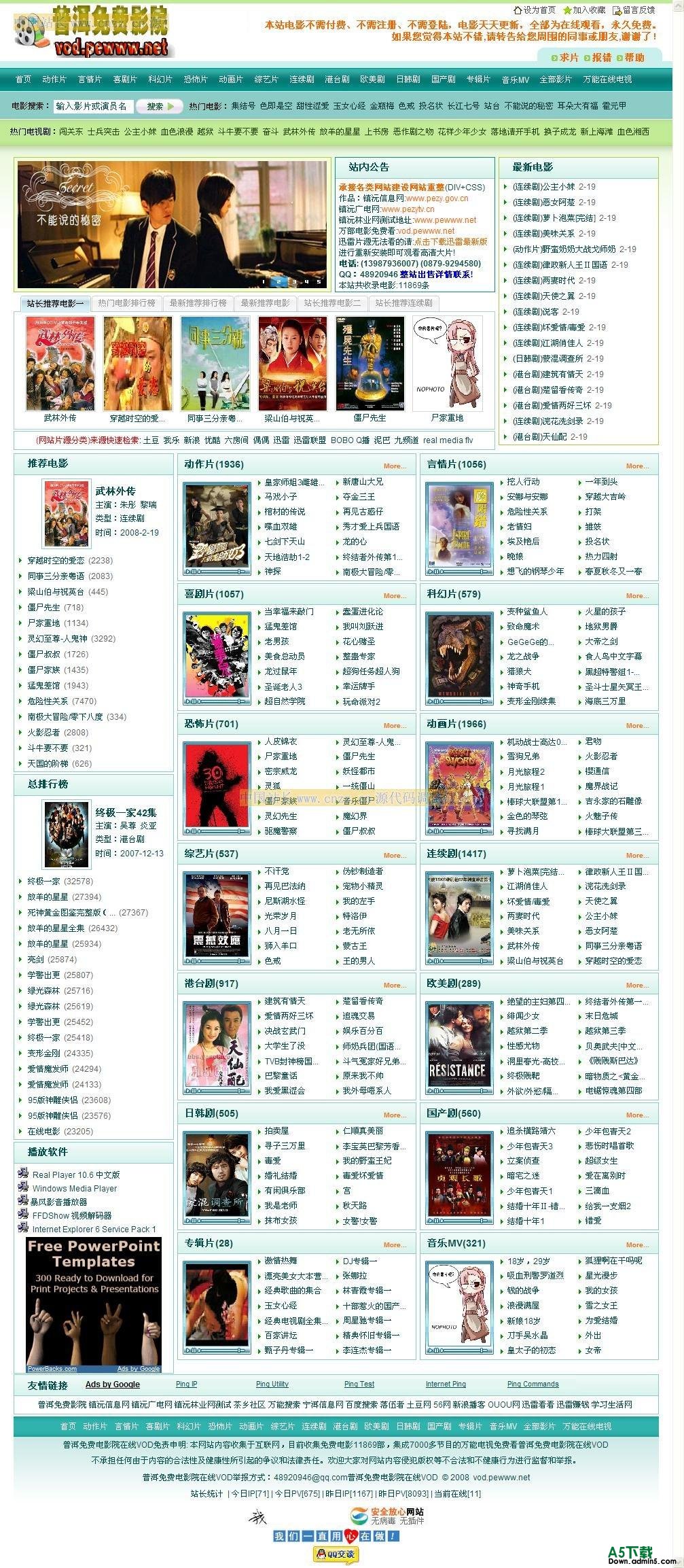 网站收集11869部免费电影在线观看、集成7000多节目的万能网络电视免注册免收费-汇集酷溜ku6(ku6.com)|土豆网(Tudou.com)|我乐网(56.com)|新浪网(Sina.com.cn)|偶偶网(Ouou.com)|优 酷(Youku.com)|六房间(6.cn)|BOBOP2P|泥巴网(Neo)P2P|远古(QVOD)P2P| 传统Media和Real| 讯雷看看| 迅雷网视联盟| 第九频道片源大集合!