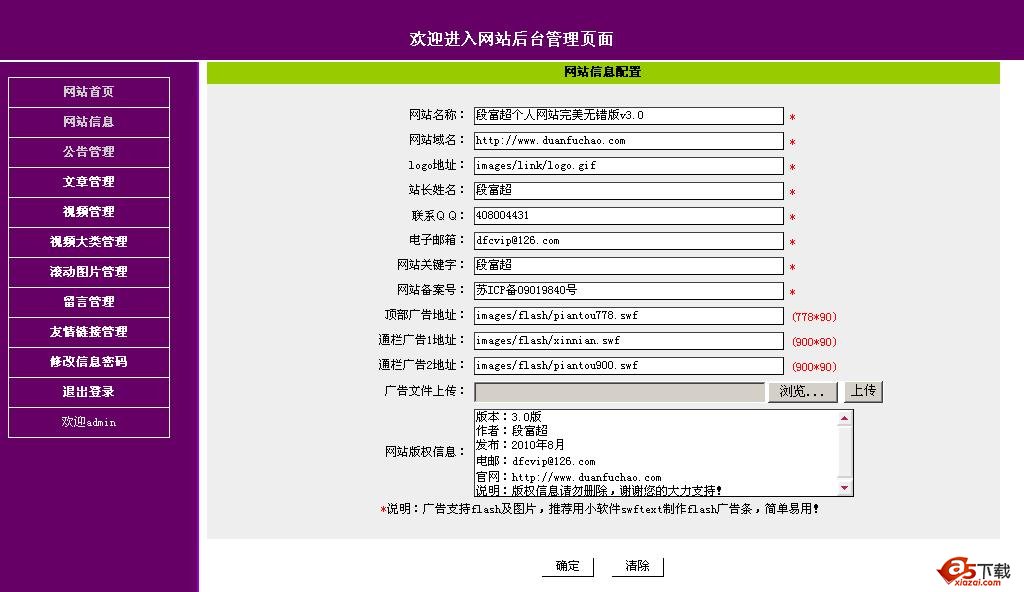 本站是段富超个人网站的3.0版本。本站适合喜欢flash音乐以及网络视频短片的朋友做个人网站,也可以做小型视频门户网站。