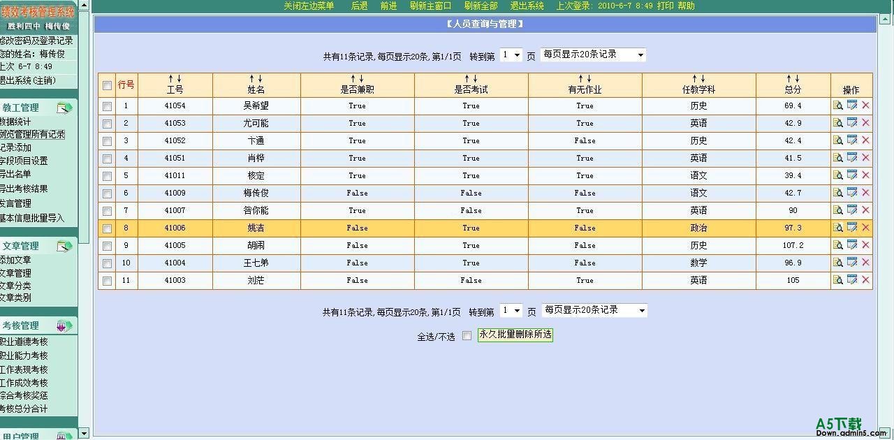 本系统参考了各类学校管理软件的精华,真正地从实用需求出发,功能强大,项目齐全,内容丰富实用,完全适合中小学教师绩效考核管理工作.主要模块有:基本信息、职业道德、教学能力、继续教育、业务获奖、出勤考核、工作量考核、教学常规考核、教学效果考核、教育效果等项目考核。支持超智能化自由查询与Excel文件的导入、导出。