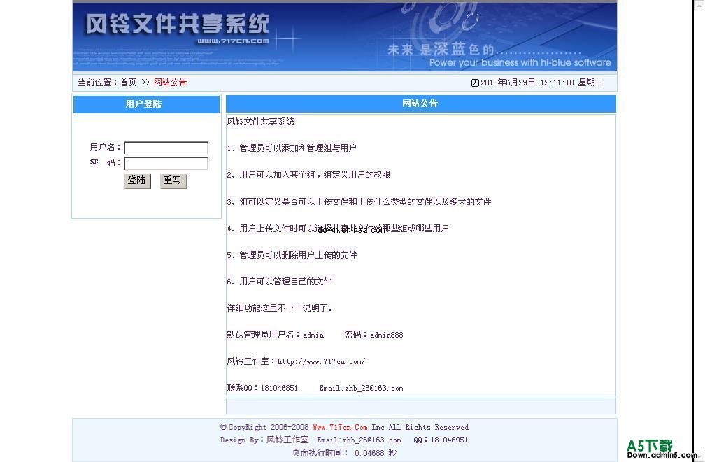 系统主要功能: 1、用户管理 2、组权限管理 3、文件上传共享 4、网站公告 5、文件管理 6、多文件上传 …… 默认管理员:admin 密码:admin888