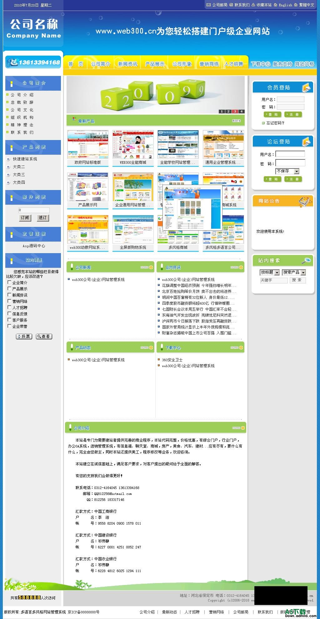 一、企业介绍:发布企业的各类信息,如企业简介、组织机构、营销网络、企业荣誉、联系方式,并可随意增加新的栏目等。