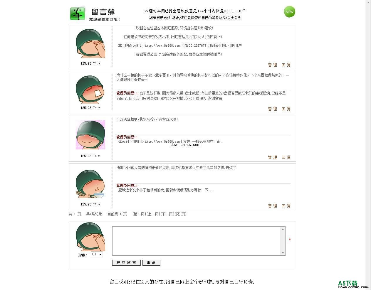 献出本网吧使用了5年的网吧留言本,此留言程序本网吧从2005-12-13 开始用到现在,使用至今留言总数达1000多条.为庆祝留言满1000条,今晚再次改版,修正去年发布的(枫叶网吧留言簿2009版)多次错误,简化了留言不必要的步骤,重新添加了新头像表情,头部透明flash也更换为跳动的花瓣,现新版程序重已开放下载.安装过程中遇到问题可跟贴,本人随时在线回复!