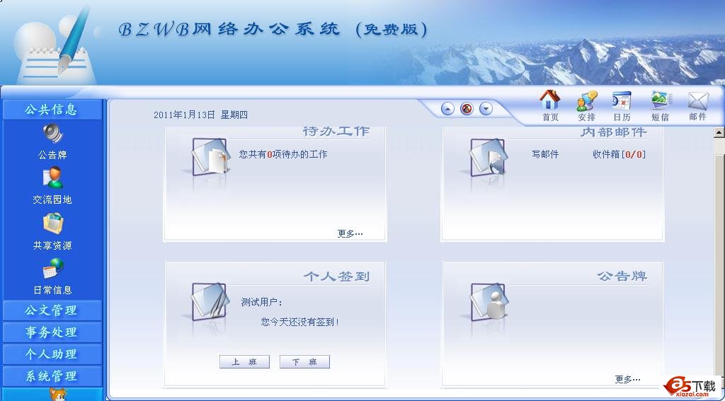 BZWB网络办公自动化软件(OA),界面是XP的风格。该软件包括完整的发文和收文流程,用户可以直接在软件中打开Word修改公文且保存公文在服务器上。在主页上用户可以看到所有信息,如个人邮件、通知、待办工作、个人签到、退签信息等。同时还有简洁实用的各种个人申请、手机短信、个人日历、个人公共通讯录、个人安排等模块。当用户有待办工作或新邮件时小精灵会用声音提醒。2.7版本在原来基础上添加了个人资源、共享资源(可以上传和共享图片、音乐和视频)、会议记录、车辆安排查询、短信通知等功能