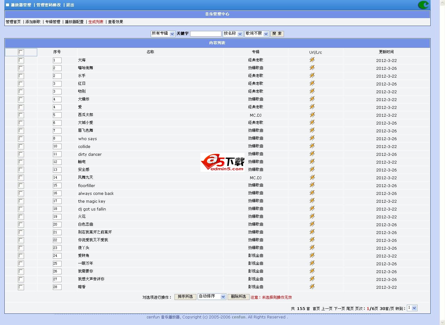 admin 管理系统由作者对 "cenfun MP3 播放器音乐管理系统" 作了修改后,适用于本播放器的管理系统.