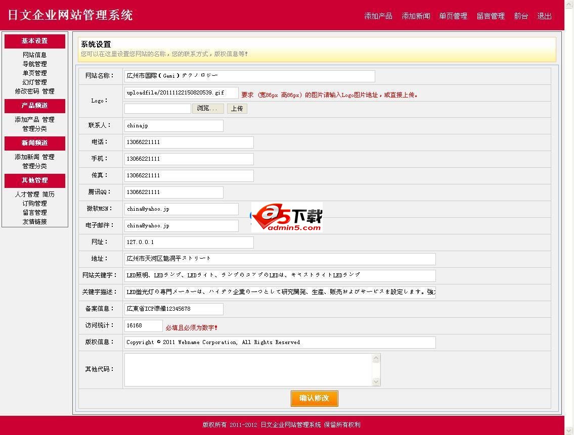 基本设置:联系方式、关键字、版权信息、LoGo等等;
