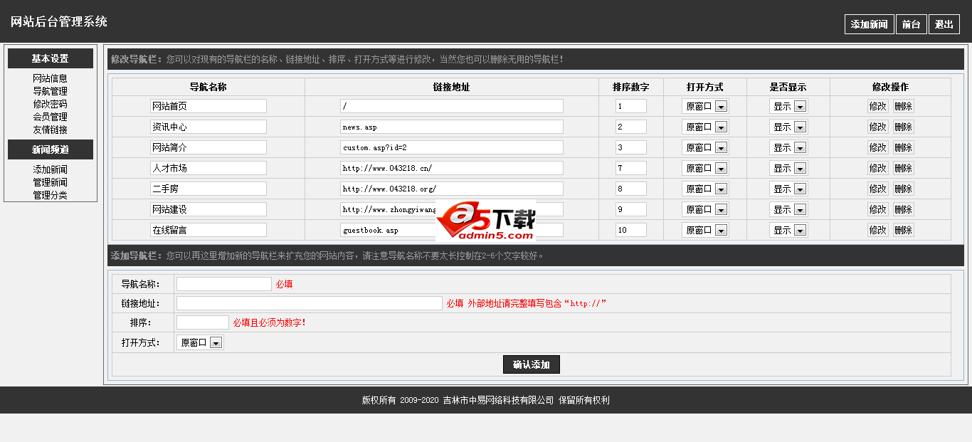 吉林中易CMS【ZY-CMS】是一款开源免费asp内容管理系统,全站CSS+div布局,为用户的修改提供方便,网站内容的每一个角落都可以在后台予以管理,是一套非常适合用做系统建站或者进行二次开发的程序核心。吉林中易CMS免费,开源,小巧,易用,功能强大,可用于企业站,文章站,图片站,博客!