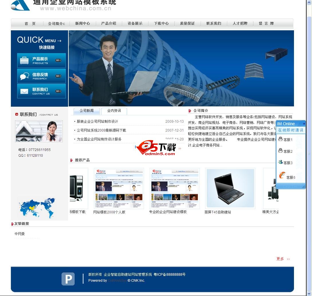 系统功能模块有:单页(如企业简介,联系内容等单页图文)、文章(新闻)列表、产品(图片、订单、规格说明等)、图片、下载、人才招聘、视频、机构组识、全国销售网点图、在线留言、评论、在线调查、在线(QQ,旺旺)浮动通讯窗,订单、在线支付、产品访问统计等企业网站常用功能,可在后台自由添加和关闭您需要的栏目模块。三年的开发和几千用户使用验证,是一套可靠实用,稳定安全的企业网站,适合中小企业公司建站使用。