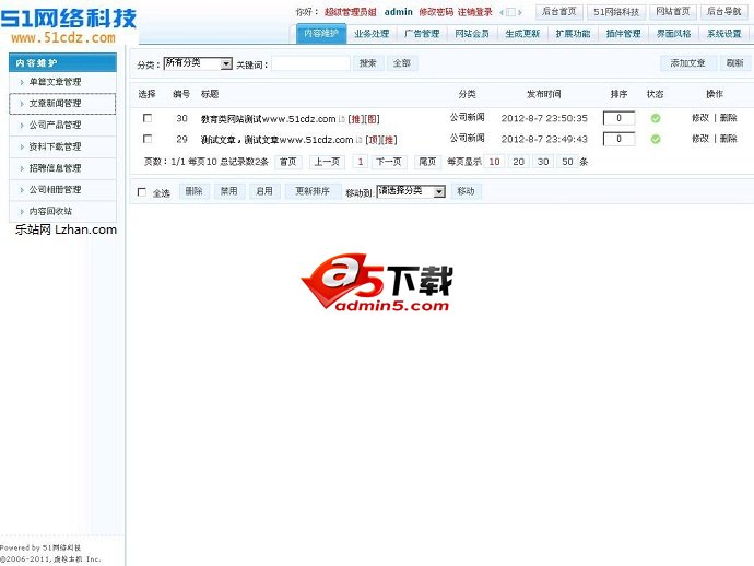 51网络科技企业网站管理系统 v1.0后台管理界面图: