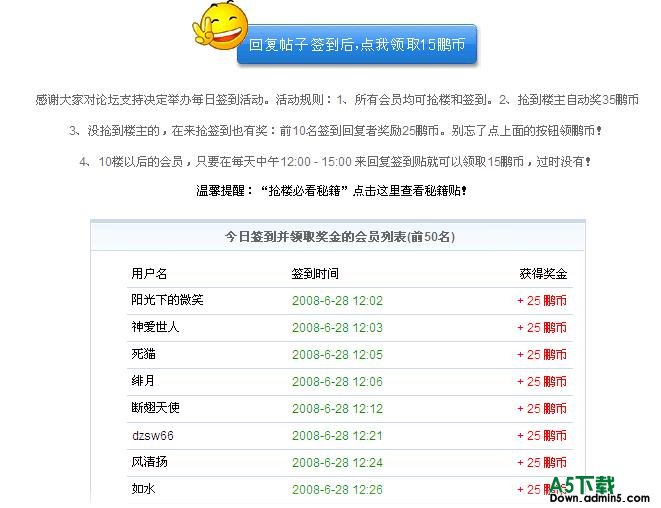 所以经过会员跟自己的一些想法,让签到变的更有趣,更互动,在规定的时间抢楼主,抢完楼主还要抢沙发,抢完沙发还要抢在10楼才能领更多积分!同时为了互动性加强,强制性的要会员回复了签到贴,才能领分!