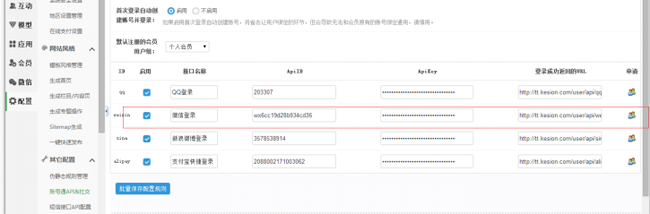 打开KESION产品后台,点开配置->其他配置->账号通API设置,将申请的微信APPID和AppSecret 填写到后台微信登录的APPID和APPKEY处;