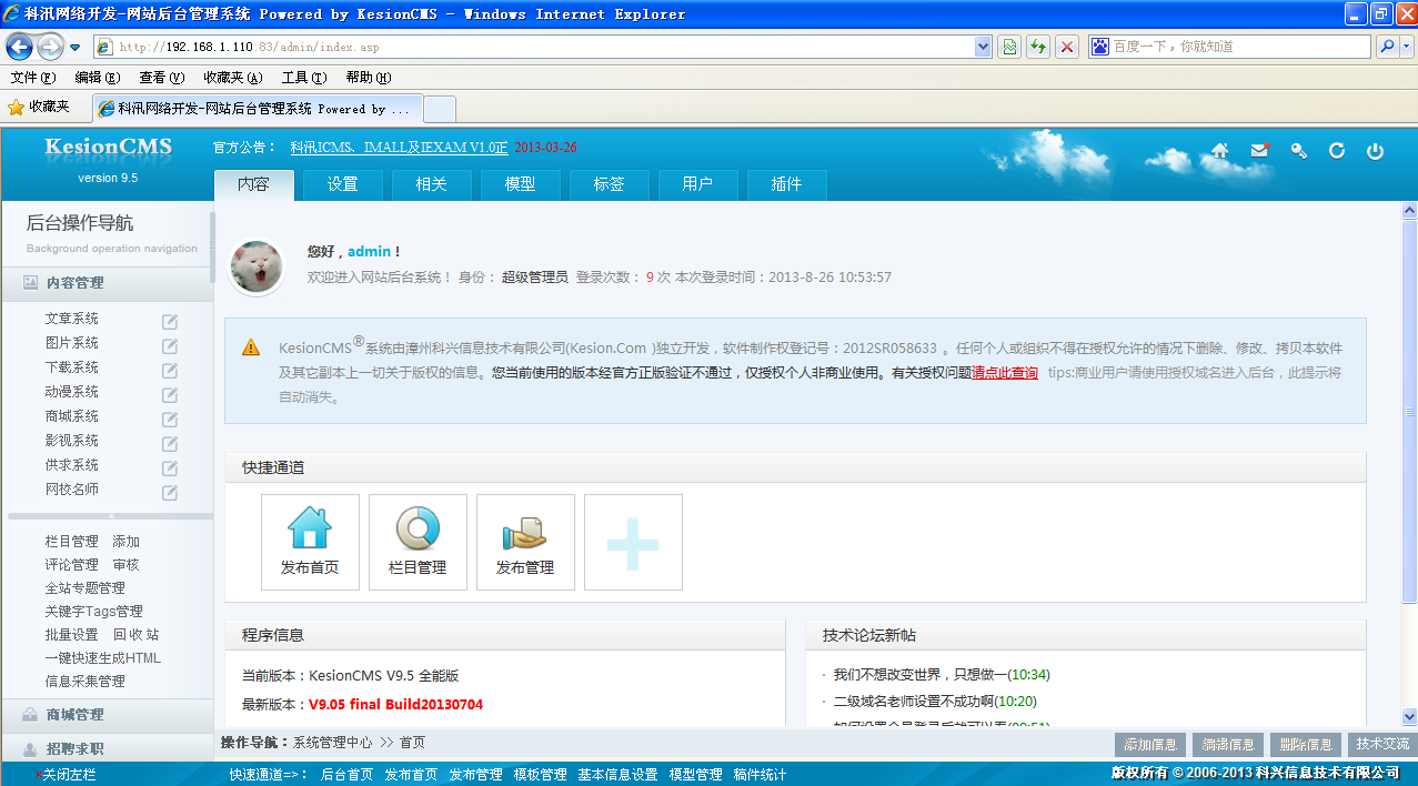 现今,最新版本v9.5将于2013-8-29号发布测试版本,经技术人员的不懈努力,此次版本升级可谓全新翻面,版本的后台代码几乎重写,采用了html5架构,让原本人性化的后台设计模式界面更加直白美观,让用户一进入后台就能一目了然,操作方便快捷,无需计算机专业人士便可操作。且此新版本程序在各个浏览器的兼容方面做足了功夫一改前版本的不足,现可更好的兼容不同浏览器,如IE、firefox、Chrome、搜狗等。