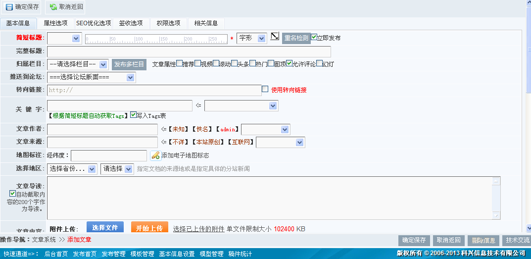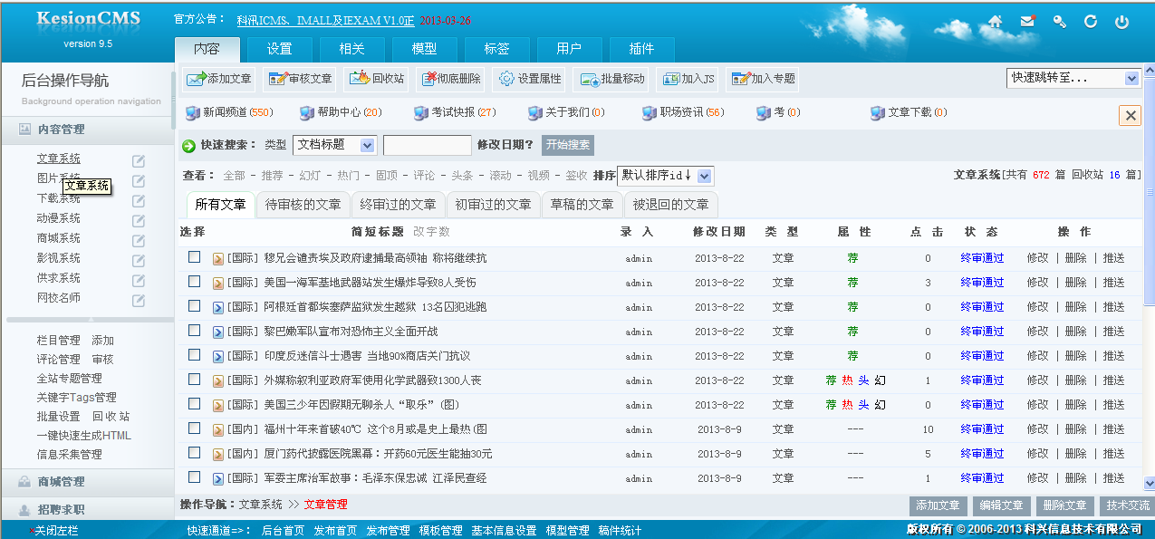 编辑好要发表的文章后,确定保存既可。这样一篇文章就已经添加好了呢。其他系统的功能在这里就不一一介绍了,更多资讯欢迎大家登陆科汛www.kesion.com了解更多。