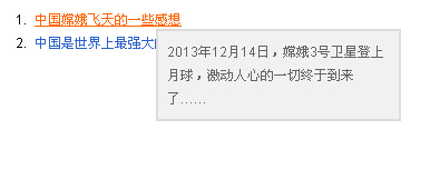 <li><a href="#" target="_blank" onmouseover="tip.start(this)" tips="2013年12月14日,嫦娥3号卫星登上月球,激动人心的一切终于到来了……">中国嫦娥飞天的一些感想</a></li>