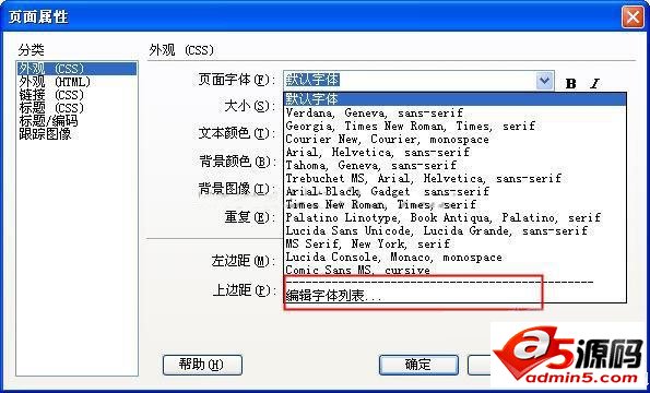 在“页面属性”窗口中,我们可以对字体进行颜色、大小、字体等修改,如果你在字体下拉菜单中找不到你想要的字体样式,可以点击“编辑字体列表”,如下图所示。
