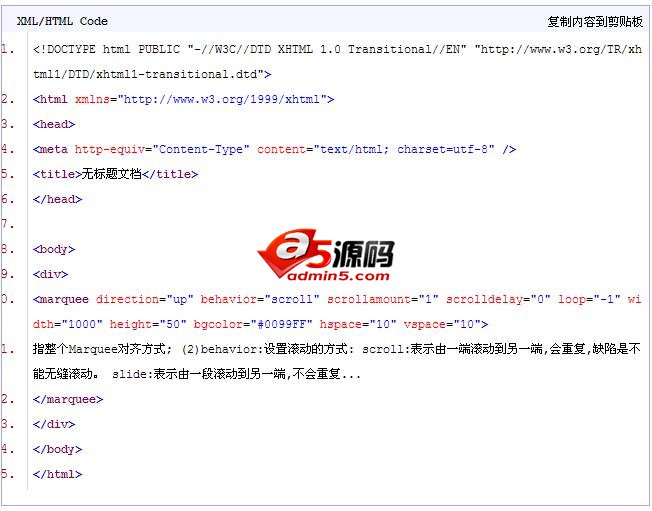 页面的自动滚动效果,可由javascript来实现,但是今天无意中发现了一个html标签 - <marquee></marquee>可以实现多种滚动效果,无需js控制。
