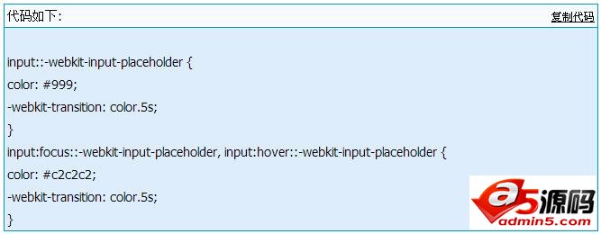 -webkit-input-placeholder,webkit特有的一个css,可以控制里面的文字样式,配合css3的动画效果和伪类,我们就可以很容易做出一个带动画的输入框,在系统登录、搜索等位置很适合。当然你要为了容IE6,这个方法是行不通。不过Ie9也支持placeholder标签,就是无法修改它的颜色而已。