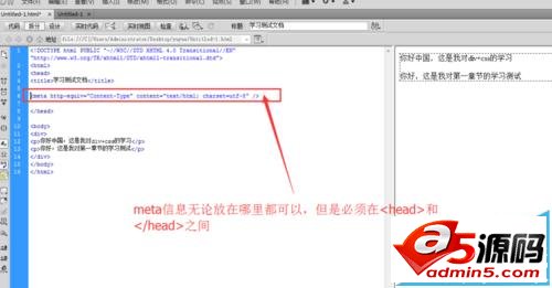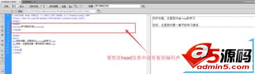 4、下面让我们改正这个错误,在网页编码里面加上声明编码的meta信息