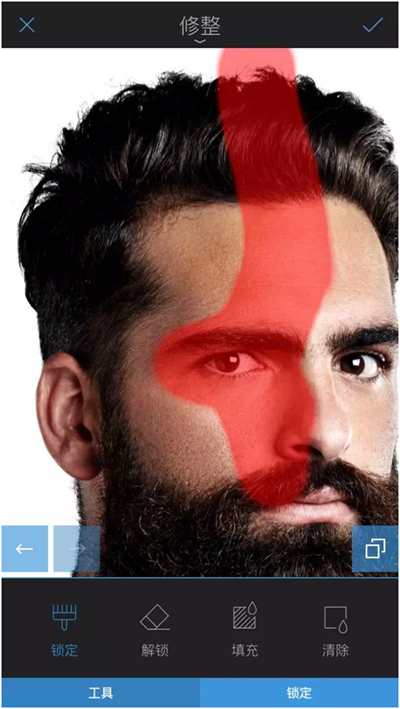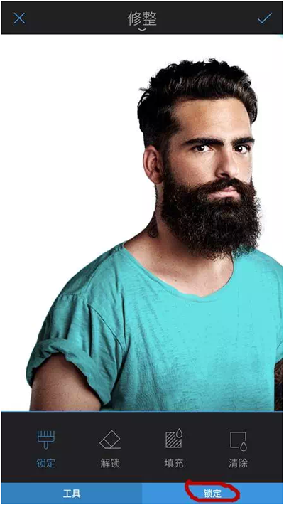 2、进入修整页面后点锁定功能,利用双指放大图片然后进行涂抹,大约人物的3/2即可,注意曲线自然;