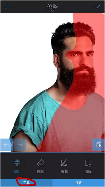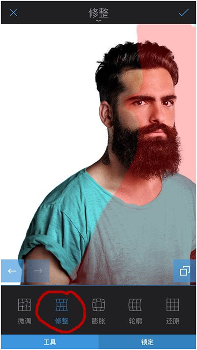 3、涂抹完毕点击工具,选择修整功能,将未锁定的部分平移拉伸,然后点击右上角√确定;