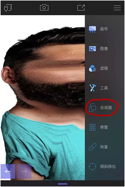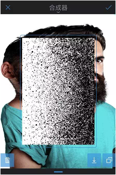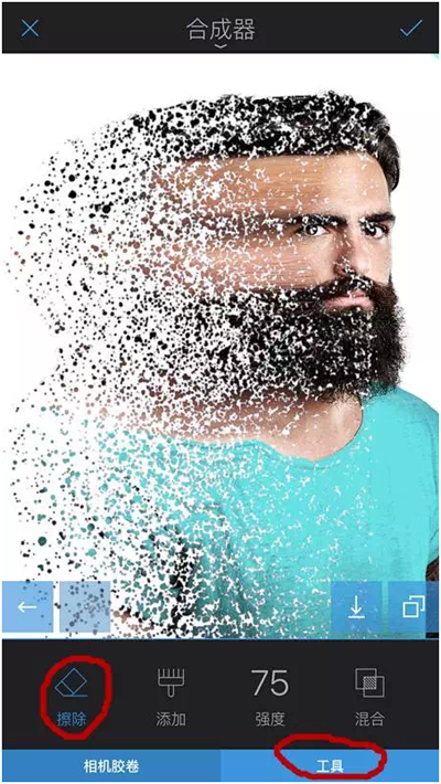 4、确定后回到主菜单,点击工具选择合成器,在相机胶卷中选择碎化图片并放大平铺整画布,并在混合功能中选择变亮模式;
